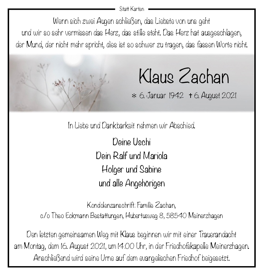 in diesen Tagen fühlen wir mit Ihnen und wünschen Ihnen von Herzen, dass Sie aus den glücklichen Erinnerungen Kraft schöpfen, um positiv in die Zukunft zu gehen. Diese Gedenkseite möge Ihnen dabei helfen, Ihre Trauer zu teilen und das Andenken gemeinsam wachzuhalten.