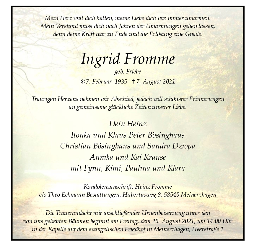 wir wünschen Ihnen von Herzen viel Kraft, dass Sie Menschen um sich haben, die Ihnen in dieser schweren Zeit beistehen und Halt geben. Zusätzlich können Sie auf dieser Gedenkseite Erinnerungen teilen und so das Andenken gemeinsam wachhalten.