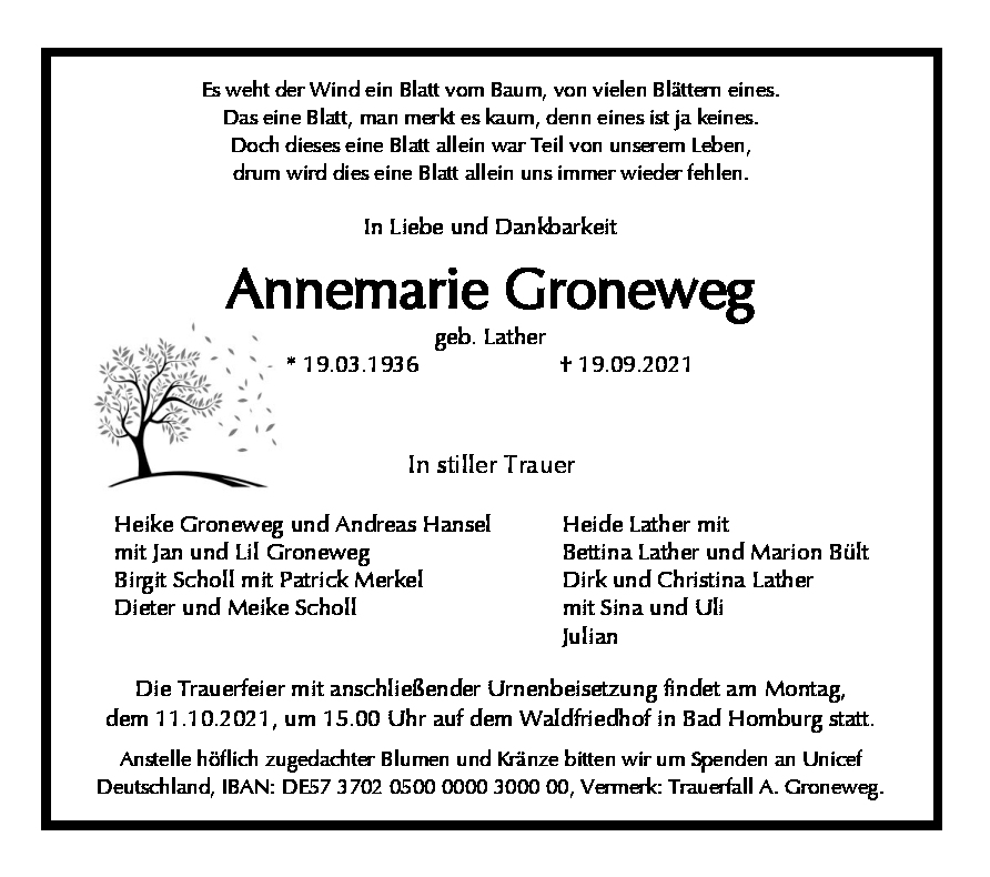 †19.09.2021, Ruhestätte: Waldfriedhof, Bad Homburg
