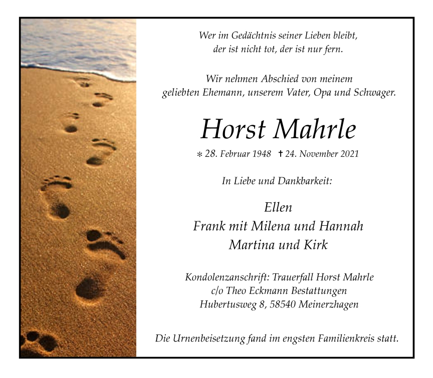 in diesen Tagen fühlen wir mit Ihnen und wünschen Ihnen von Herzen, dass Sie aus den glücklichen Erinnerungen Kraft schöpfen, um positiv in die Zukunft zu gehen.