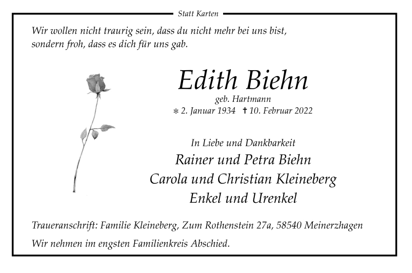 in diesen Tagen fühlen wir mit Ihnen und wünschen Ihnen von Herzen, dass Sie aus den glücklichen Erinnerungen Kraft schöpfen, um positiv in die Zukunft zu gehen. Diese Gedenkseite möge Ihnen dabei helfen, Ihre Trauer zu teilen und das Andenken gemeinsam wachzuhalten.