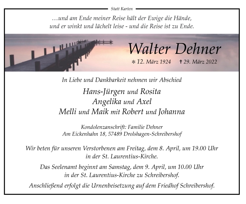 in diesen Tagen fühlen wir mit Ihnen und wünschen Ihnen von Herzen, dass Sie aus den glücklichen Erinnerungen Kraft schöpfen, um positiv in die Zukunft zu gehen. Diese Gedenkseite möge Ihnen dabei helfen, Ihre Trauer zu teilen und das Andenken gemeinsam wachzuhalten.