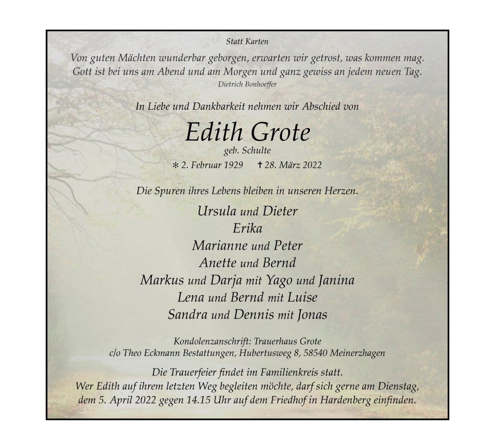 in diesen Tagen fühlen wir mit Ihnen und wünschen Ihnen von Herzen, dass Sie aus den glücklichen Erinnerungen Kraft schöpfen, um positiv in die Zukunft zu gehen. Diese Gedenkseite möge Ihnen dabei helfen, Ihre Trauer zu teilen und das Andenken gemeinsam wachzuhalten.