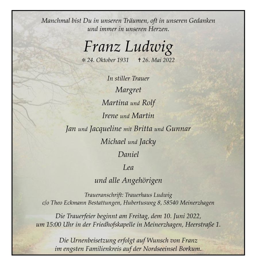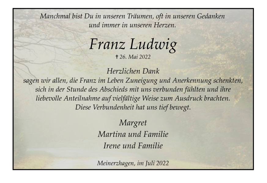 in diesen Tagen fühlen wir mit Ihnen und wünschen Ihnen von Herzen, dass Sie aus den glücklichen Erinnerungen Kraft schöpfen, um positiv in die Zukunft zu gehen. Diese Gedenkseite möge Ihnen dabei helfen, Ihre Trauer zu teilen und das Andenken gemeinsam wachzuhalten.