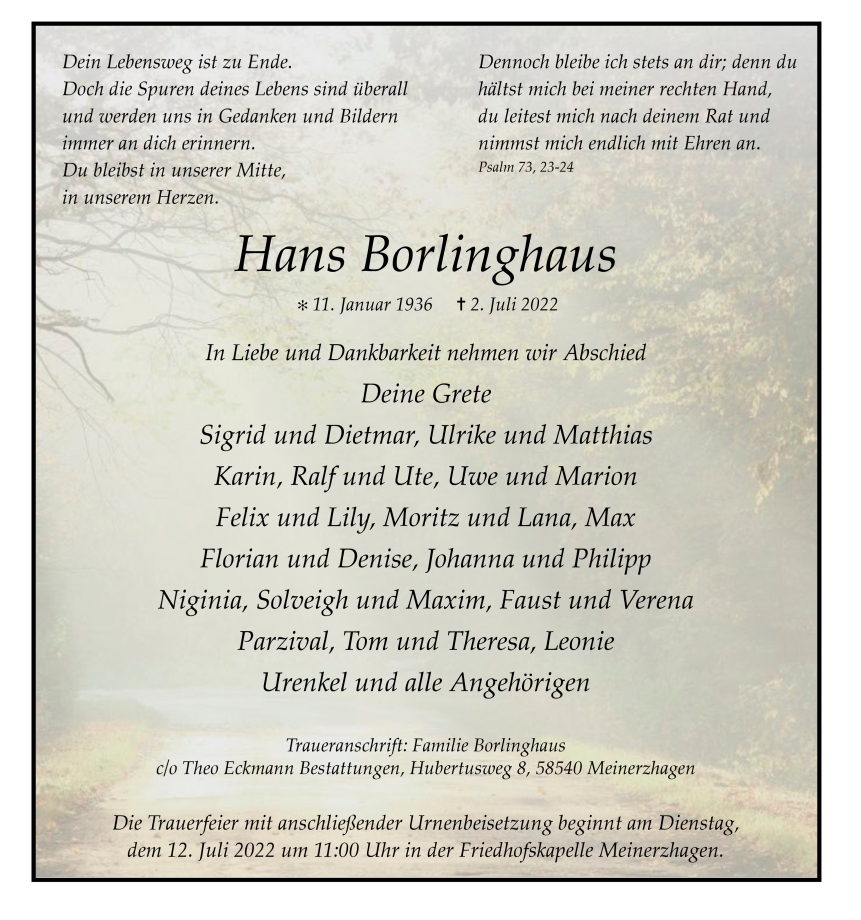 in diesen Tagen fühlen wir mit Ihnen und wünschen Ihnen von Herzen, dass Sie aus den glücklichen Erinnerungen Kraft schöpfen, um positiv in die Zukunft zu gehen. Diese Gedenkseite möge Ihnen dabei helfen, Ihre Trauer zu teilen und das Andenken gemeinsam wachzuhalten.