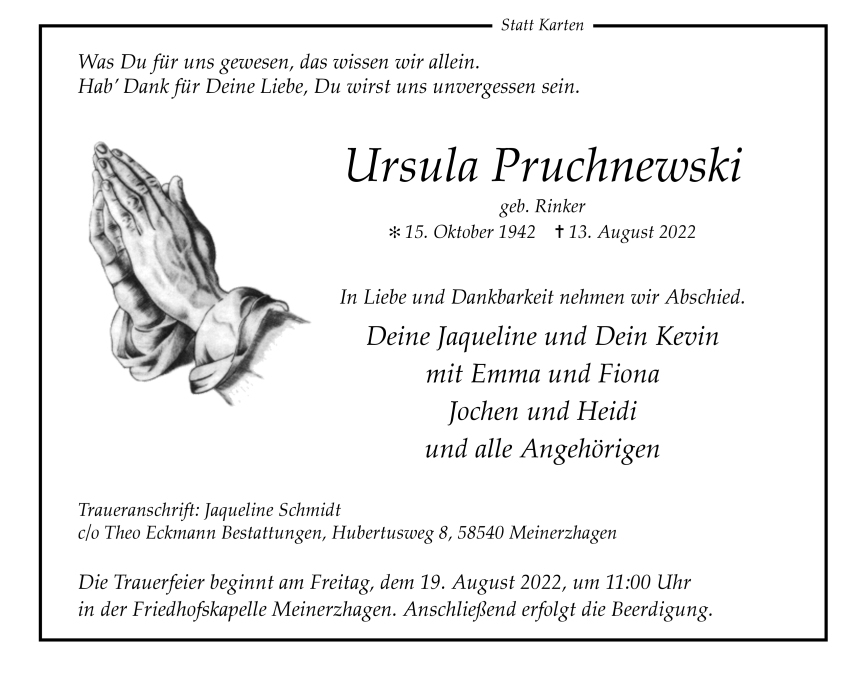 in diesen Tagen fühlen wir mit Ihnen und wünschen Ihnen von Herzen, dass Sie aus den glücklichen Erinnerungen Kraft schöpfen, um positiv in die Zukunft zu gehen. Diese Gedenkseite möge Ihnen dabei helfen, Ihre Trauer zu teilen und das Andenken gemeinsam wachzuhalten.