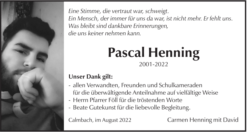 Lieber Pascal Dominik Henning alle Menschen wo sagen alles wird gut stimmt nicht nichts ist gut ohne dich ist alles Langweilig und scheiße geworden du fehlst uns alle hier so sehr dein Humor und so weiter fehlt uns wir vermissen dich wir hoffen das er dir gut geht da wo du jetzt bist und das du keine schmerzen mehr hast beziehungweise alles in Ordnung ist bei dir wir lieben dich und vermisse dich als Held gekommen als Held gegangen♥️ ich bin dir mein ganzes Leben dankbar in liebe dein Bruder David Henning. Du bist der beste Bruder der ganzen Welt für mich gewesen♥️ Von Tag zu Tag vermiss ich dich mehr Pasi♥️ Wir lieben dich Gruß Mama und dein Bruder irgendwann sehen wir uns wieder♥️ Rest in Peace pasi♥️ Schlaf gut♥️