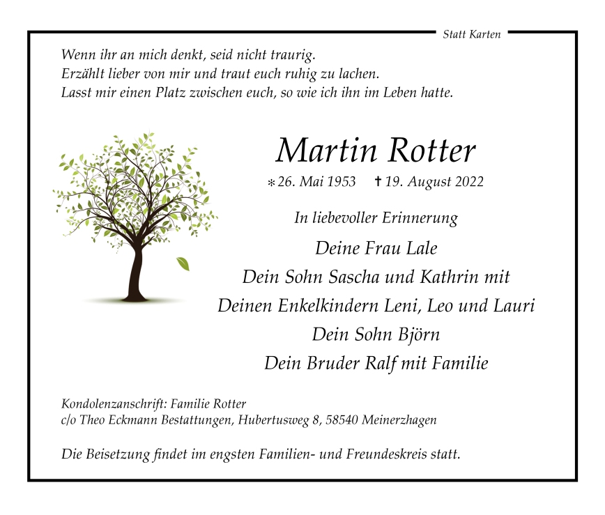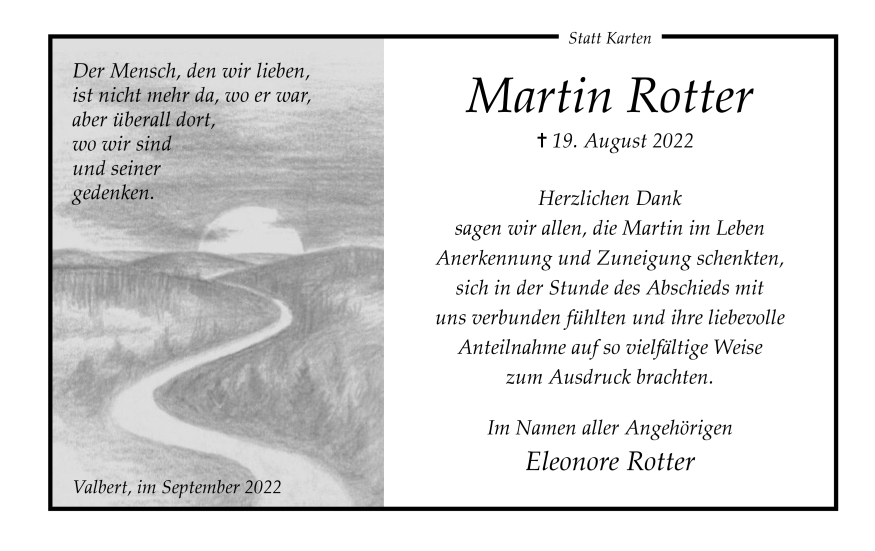 in diesen Tagen fühlen wir mit Ihnen und wünschen Ihnen von Herzen, dass Sie aus den glücklichen Erinnerungen Kraft schöpfen, um positiv in die Zukunft zu gehen. Diese Gedenkseite möge Ihnen dabei helfen, Ihre Trauer zu teilen und das Andenken gemeinsam wachzuhalten.