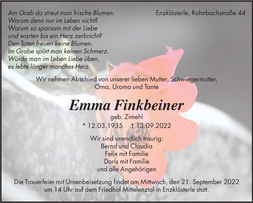 †13.09.2022, Ruhestätte: Friedhof Mittelenztal in Enzklösterle