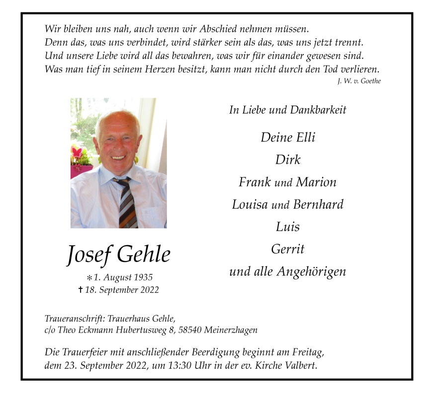 in diesen Tagen fühlen wir mit Ihnen und wünschen Ihnen von Herzen, dass Sie aus den glücklichen Erinnerungen Kraft schöpfen, um positiv in die Zukunft zu gehen. Diese Gedenkseite möge Ihnen dabei helfen, Ihre Trauer zu teilen und das Andenken gemeinsam wachzuhalten.