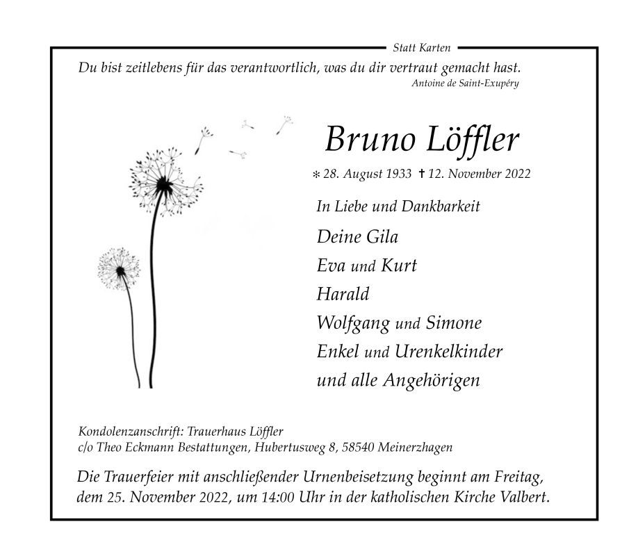 Liebe Gila, liebe Trauerfamilie haben heute vom Ableben Deines lieben Bruno erfahren. Wir wünschen Dir viel Kraft und alles Liebe. Hannes, Uschi und Hans-Peter