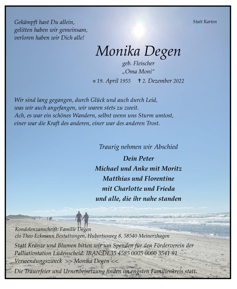 in diesen Tagen fühlen wir mit Ihnen und wünschen Ihnen von Herzen, dass Sie aus den glücklichen Erinnerungen Kraft schöpfen, um positiv in die Zukunft zu gehen. Diese Gedenkseite möge Ihnen dabei helfen, Ihre Trauer zu teilen und das Andenken gemeinsam wachzuhalten.