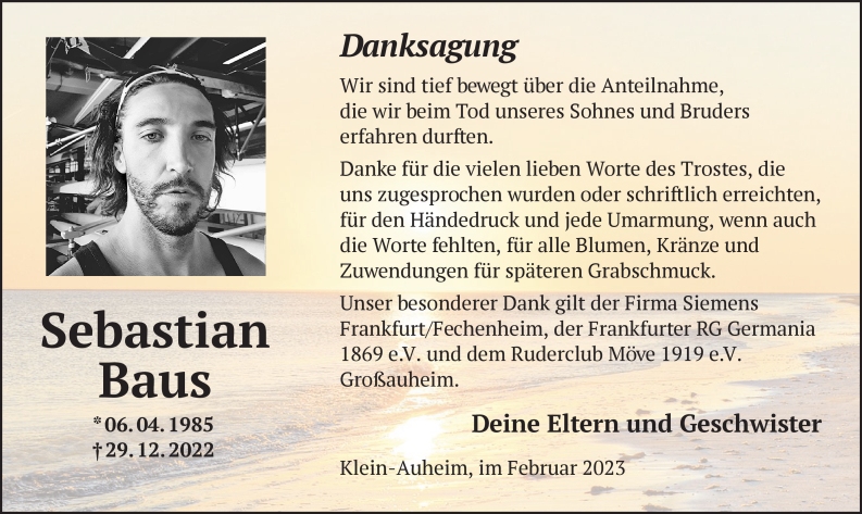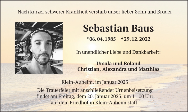 Mit tiefer Bestürzung haben wir von dem plötzlichen Tod Ihres Sohnes Sebastian,einem ehemaligen Klassenkameraden unseres Sohnes, erfahren. Unser ganzes Mitgefühl gilt Ihrer Familie. Möge Gott Ihnen viel Kraft für die Zukunft geben.