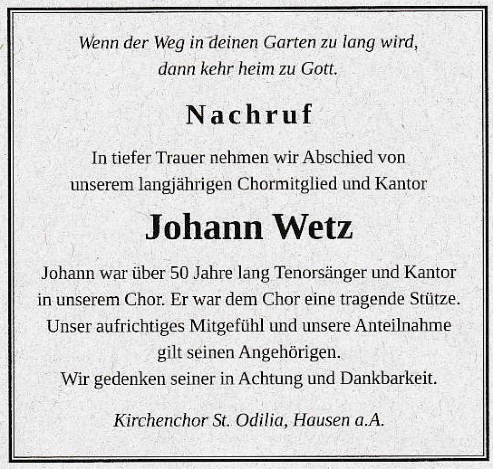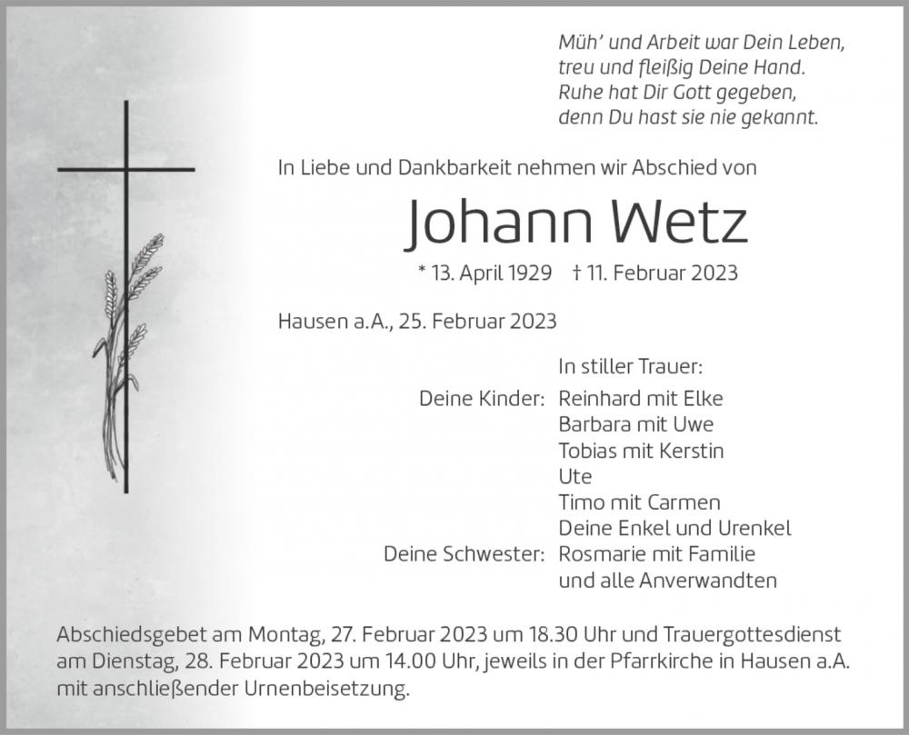Abschiedsgebet am Montag, 27. Februar 2023 um 18:30 Uhr und Trauergottesdienst am Dienstag, 28. Februar 2023 um 14:00 Uhr, jeweils in der Pfarrkirche St. Odilia in Hausen a. A. mit anschließender Urnenbeisetzung.