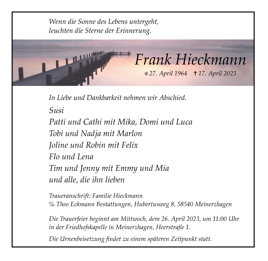 in diesen Tagen fühlen wir mit Ihnen und wünschen Ihnen von Herzen, dass Sie aus den glücklichen Erinnerungen Kraft schöpfen, um positiv in die Zukunft zu gehen. Diese Gedenkseite möge Ihnen dabei helfen, Ihre Trauer zu teilen und das Andenken gemeinsam wachzuhalten.