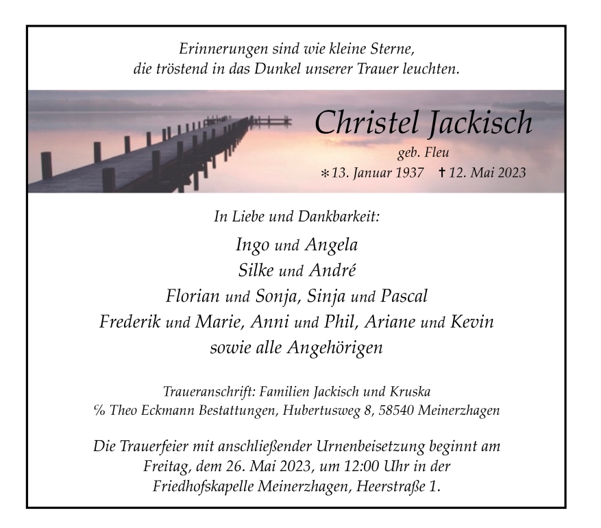 in diesen Tagen fühlen wir mit Ihnen und wünschen Ihnen von Herzen, dass Sie aus den glücklichen Erinnerungen Kraft schöpfen, um positiv in die Zukunft zu gehen. Diese Gedenkseite möge Ihnen dabei helfen, Ihre Trauer zu teilen und das Andenken gemeinsam wachzuhalten.