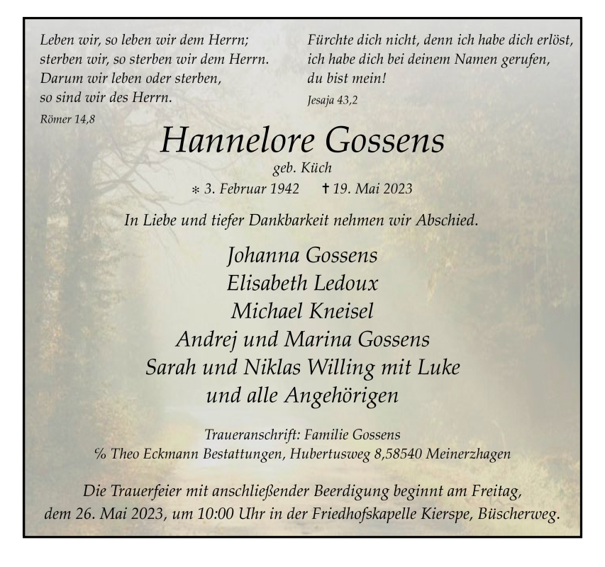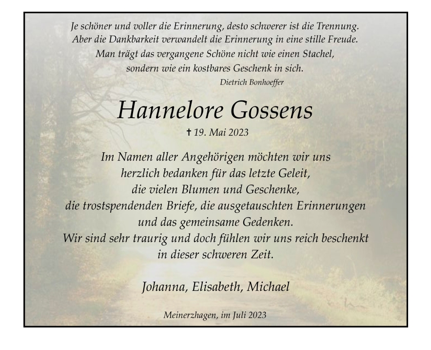 in diesen Tagen fühlen wir mit Ihnen und wünschen Ihnen von Herzen, dass Sie aus den glücklichen Erinnerungen Kraft schöpfen, um positiv in die Zukunft zu gehen. Diese Gedenkseite möge Ihnen dabei helfen, Ihre Trauer zu teilen und das Andenken gemeinsam wachzuhalten.