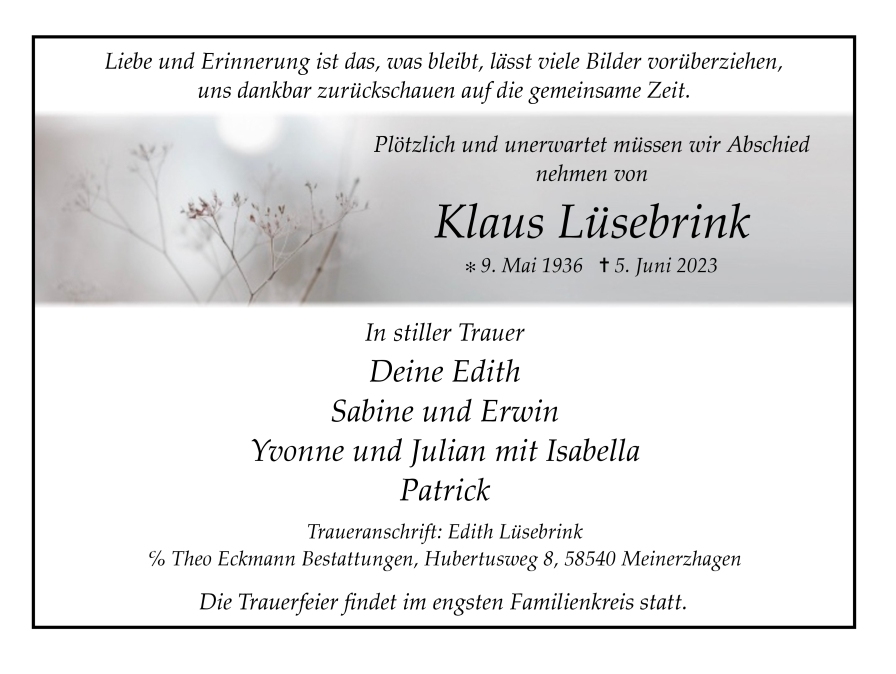 in diesen Tagen fühlen wir mit Ihnen und wünschen Ihnen von Herzen, dass Sie aus den glücklichen Erinnerungen Kraft schöpfen, um positiv in die Zukunft zu gehen. Diese Gedenkseite möge Ihnen dabei helfen, Ihre Trauer zu teilen und das Andenken gemeinsam wachzuhalten.