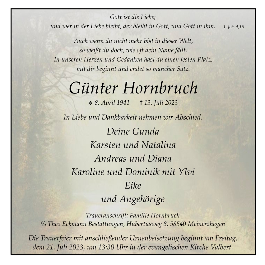 in diesen Tagen fühlen wir mit Ihnen und wünschen Ihnen von Herzen, dass Sie aus den glücklichen Erinnerungen Kraft schöpfen, um positiv in die Zukunft zu gehen. Diese Gedenkseite möge Ihnen dabei helfen, Ihre Trauer zu teilen und das Andenken gemeinsam wachzuhalten.