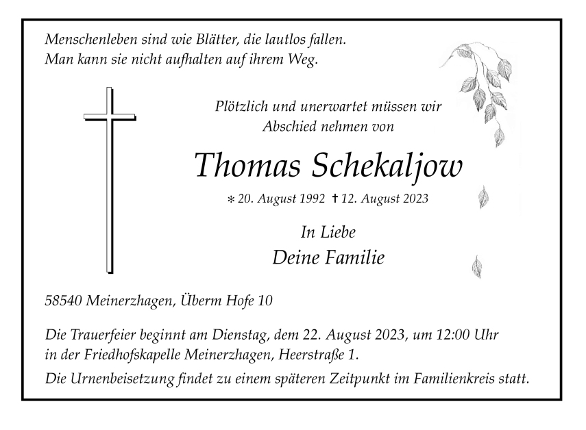 wir wünschen Ihnen von Herzen viel Kraft, dass Sie Menschen um sich haben, die Ihnen in dieser schweren Zeit beistehen und Halt geben. Zusätzlich können Sie auf dieser Gedenkseite Erinnerungen teilen und so das Andenken gemeinsam wachhalten.