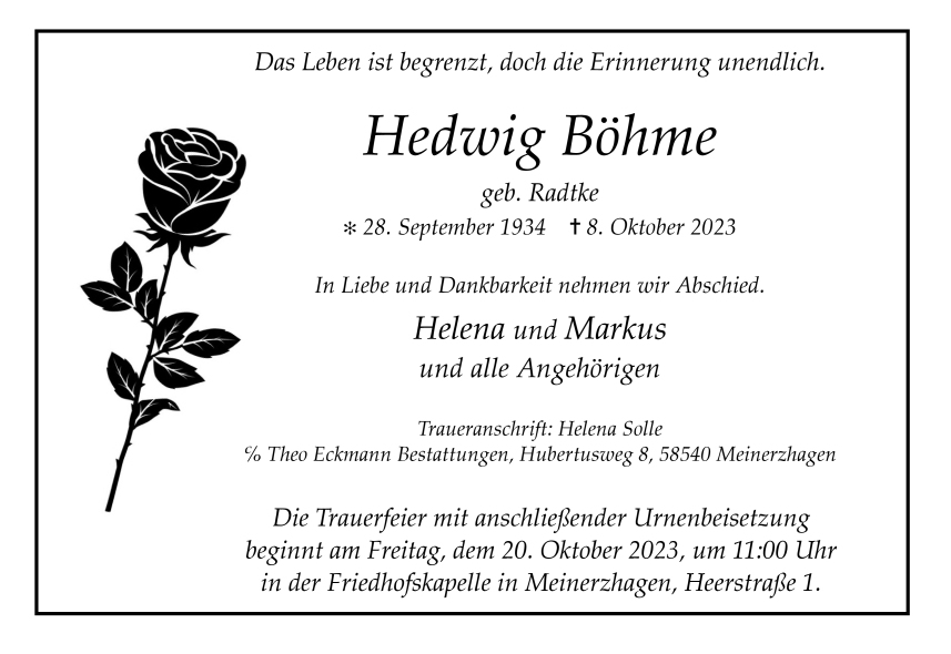 in diesen Tagen fühlen wir mit Ihnen und wünschen Ihnen von Herzen, dass Sie aus den glücklichen Erinnerungen Kraft schöpfen, um positiv in die Zukunft zu gehen. Diese Gedenkseite möge Ihnen dabei helfen, Ihre Trauer zu teilen und das Andenken gemeinsam wachzuhalten.