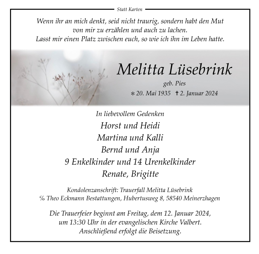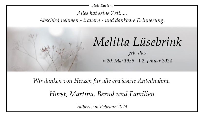 in diesen Tagen fühlen wir mit Ihnen und wünschen Ihnen von Herzen, dass Sie aus den glücklichen Erinnerungen Kraft schöpfen, um positiv in die Zukunft zu gehen. Diese Gedenkseite möge Ihnen dabei helfen, Ihre Trauer zu teilen und das Andenken gemeinsam wachzuhalten.