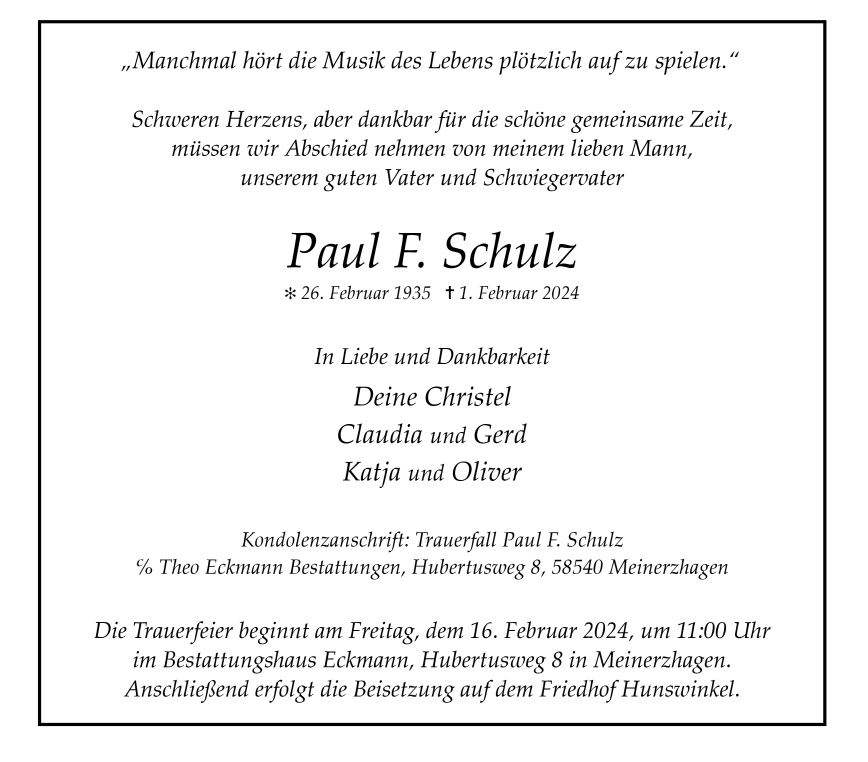 in diesen Tagen fühlen wir mit Ihnen und wünschen Ihnen von Herzen, dass Sie aus den glücklichen Erinnerungen Kraft schöpfen, um positiv in die Zukunft zu gehen. Diese Gedenkseite möge Ihnen dabei helfen, Ihre Trauer zu teilen und das Andenken gemeinsam wachzuhalten.