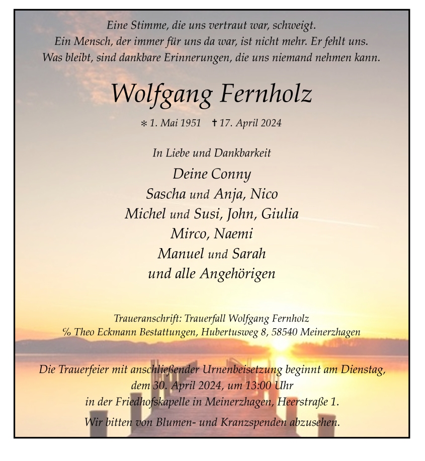 in diesen Tagen fühlen wir mit Ihnen und wünschen Ihnen von Herzen, dass Sie aus den glücklichen Erinnerungen Kraft schöpfen, um positiv in die Zukunft zu gehen. Diese Gedenkseite möge Ihnen dabei helfen, Ihre Trauer zu teilen und das Andenken gemeinsam wachzuhalten.
