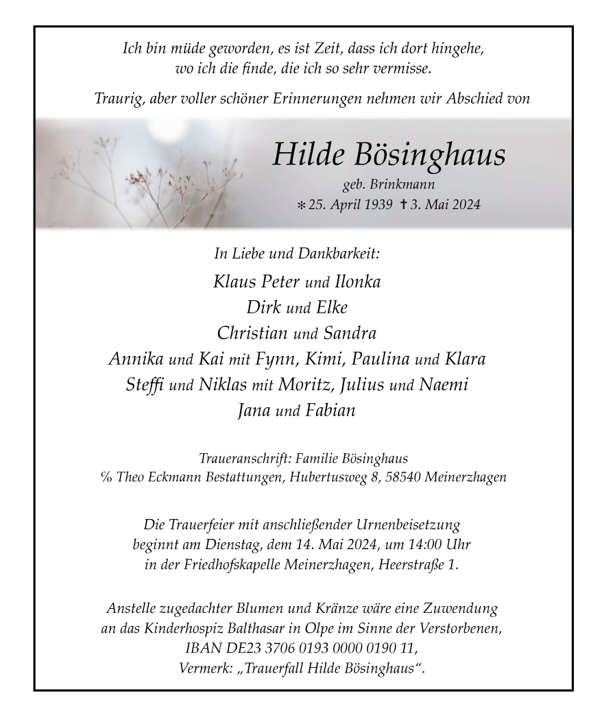 wir wünschen Ihnen von Herzen viel Kraft, dass Sie Menschen um sich haben, die Ihnen in dieser schweren Zeit beistehen und Halt geben. Zusätzlich können Sie auf dieser Gedenkseite Erinnerungen teilen und so das Andenken gemeinsam wachhalten.