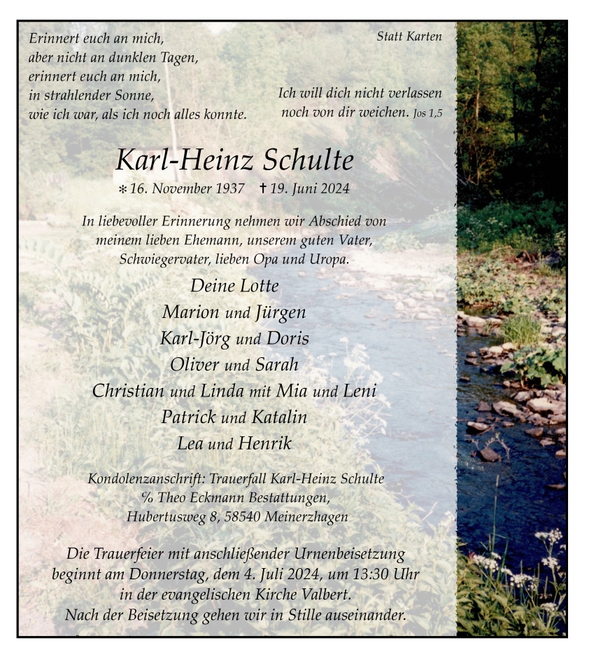 in diesen Tagen fühlen wir mit Ihnen und wünschen Ihnen von Herzen, dass Sie aus den glücklichen Erinnerungen Kraft schöpfen, um positiv in die Zukunft zu gehen. Diese Gedenkseite möge Ihnen dabei helfen, Ihre Trauer zu teilen und das Andenken gemeinsam wachzuhalten.