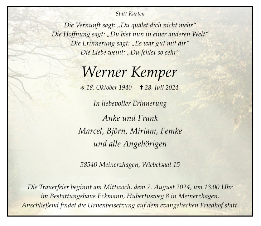 in diesen Tagen fühlen wir mit Ihnen und wünschen Ihnen von Herzen, dass Sie aus den glücklichen Erinnerungen Kraft schöpfen, um positiv in die Zukunft zu gehen. Diese Gedenkseite möge Ihnen dabei helfen, Ihre Trauer zu teilen und das Andenken gemeinsam wachzuhalten.