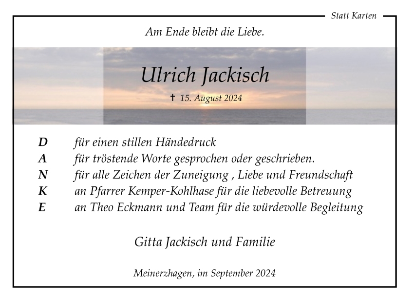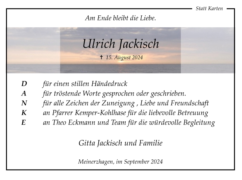 in diesen Tagen fühlen wir mit Ihnen und wünschen Ihnen von Herzen, dass Sie aus den glücklichen Erinnerungen Kraft schöpfen, um positiv in die Zukunft zu gehen. Diese Gedenkseite möge Ihnen dabei helfen, Ihre Trauer zu teilen und das Andenken gemeinsam wachzuhalten.