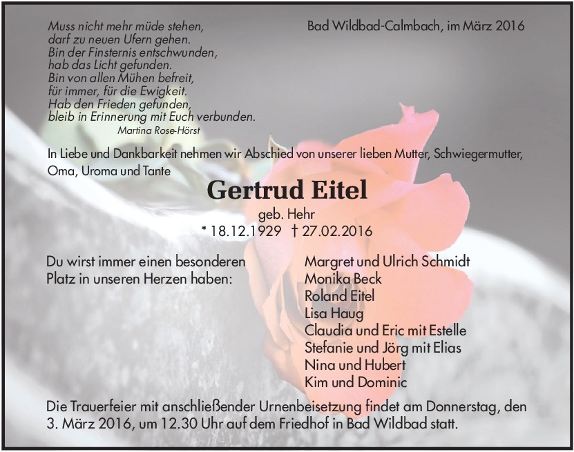Hallo Oma Gertrud. Ich denke fast 5 Jahre nach deinem Tod noch immer fast täglich an dich und vermisse dich. Mama ist jetzt auch gestorben. Bitte pass im Himmel gut auf sie auf! Ich liebe euch beide! Deine Enkelin Nina
