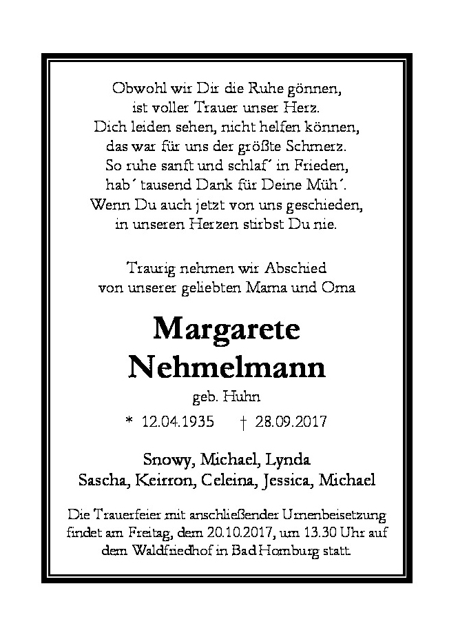 †28.09.2017, Ruhestätte: Waldfriedhof, Bad Homburg