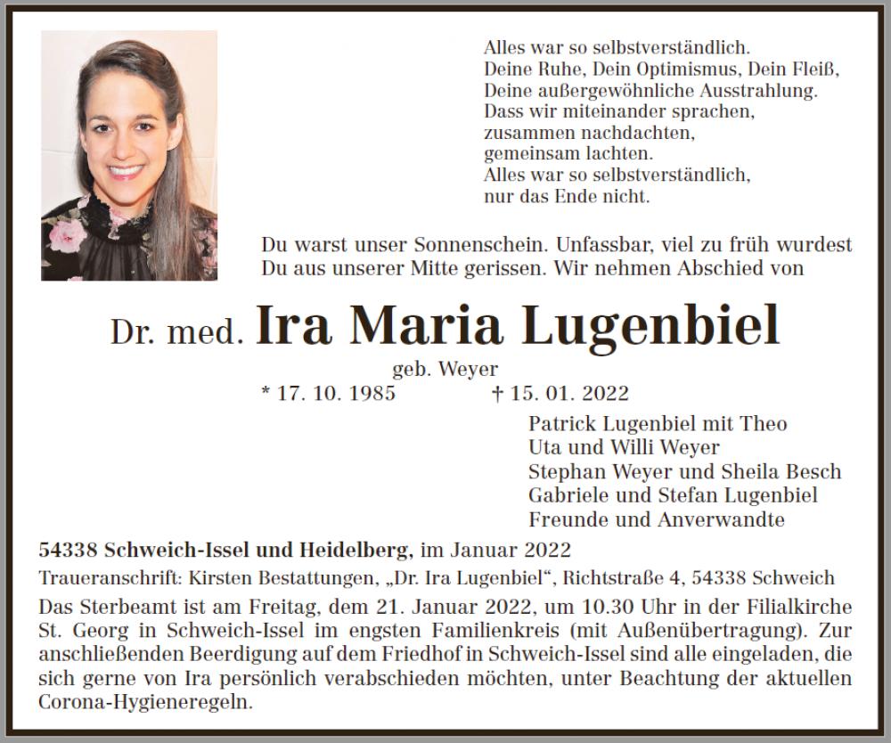 Wir drücken dir, lieber Patrick, eurem kleinen Sohn und euren Familien unser tief empfundenes Mitgefühl aus. Meine letzte persönliche Begegnung mit Ira war im September des vergangenen Jahres. Das Gespräch war nur kurz - beide waren wir auf dem Weg zu unseren Arbeitsplätzen - und alles schien gut zu sein.